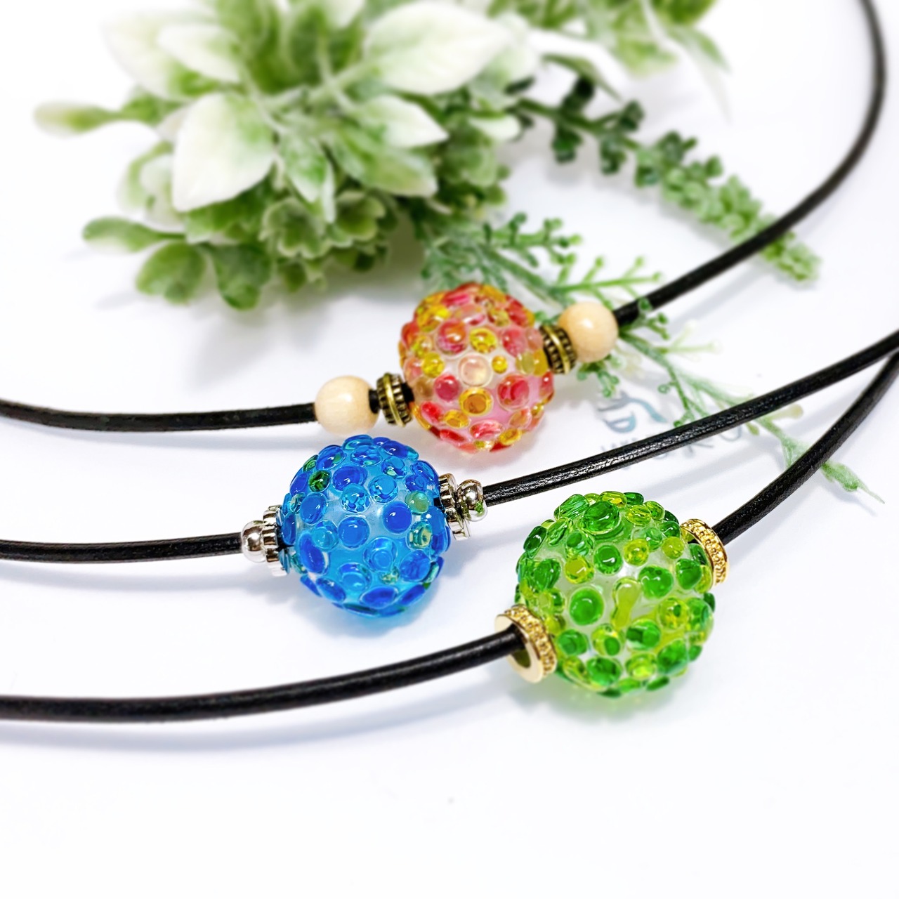 上記の追加購入でロー引き紐のネックレスなどにお仕立てすることができます